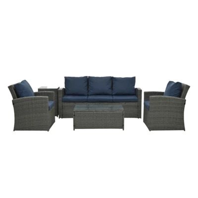 Syemin 5PCS Patio Seating Rattan Furniture Set Sectional Sofa Cushioned Garden, Tempered Glass Table, Blue, 67.5″*24.2″*29.7″