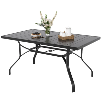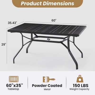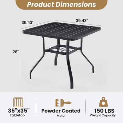 Upgrade your outdoor dining experience with this durable patio table. Designed with a 1.57″ umbrella hole for perfect shade, it ensures comfort on sunny days. Heavy-duty metal construction with curved legs offers stability for gatherings.