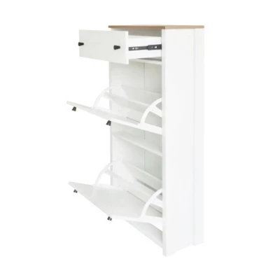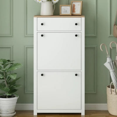 - Crisp and Clean Appearance: Featuring an eye-catching farmhouse inspired design, the shoe cabinet is a stylish solution to organizing your entryway. Tapered legs add refined style and provide elevation to deter dust buildup.