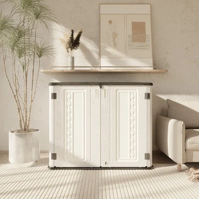 • Double Shelves: Equipped with double shelves, this storage shed provides ample space for organizing your outdoor items. Store trash cans on the lower shelf and garden accessories on the upper shelf.